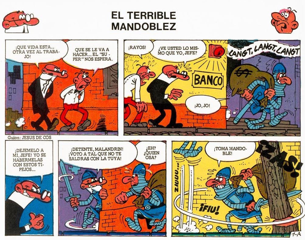 Mortadelo y Filemón se cruzan por la calle con el peligroso caco "Mandóblez" que se dedica a robar por las calles vestido con un atuendo medieval.