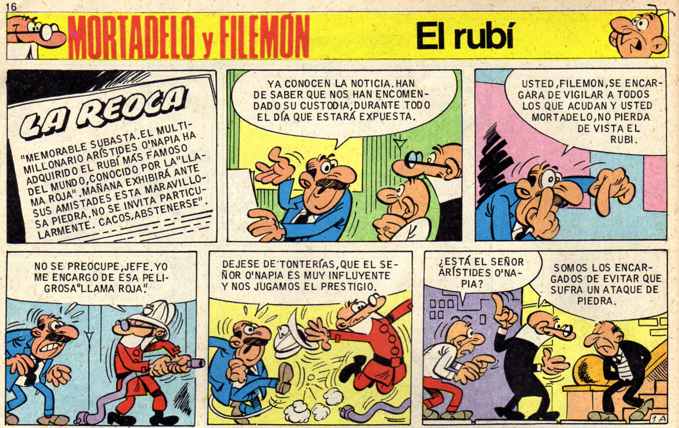 El multimillonario Arístides O'Napia ha adquirido el rubí más famoso del mundo, "La llama roja", y piensa exhibirla mañana en público. El Súper pide a Mortadelo y Filemón que custodien el rubí. Filemón tendrá que vigilar a todos los que acudan al evento y la labor de Mortadelo consistirá en no perder de vista al rubí.