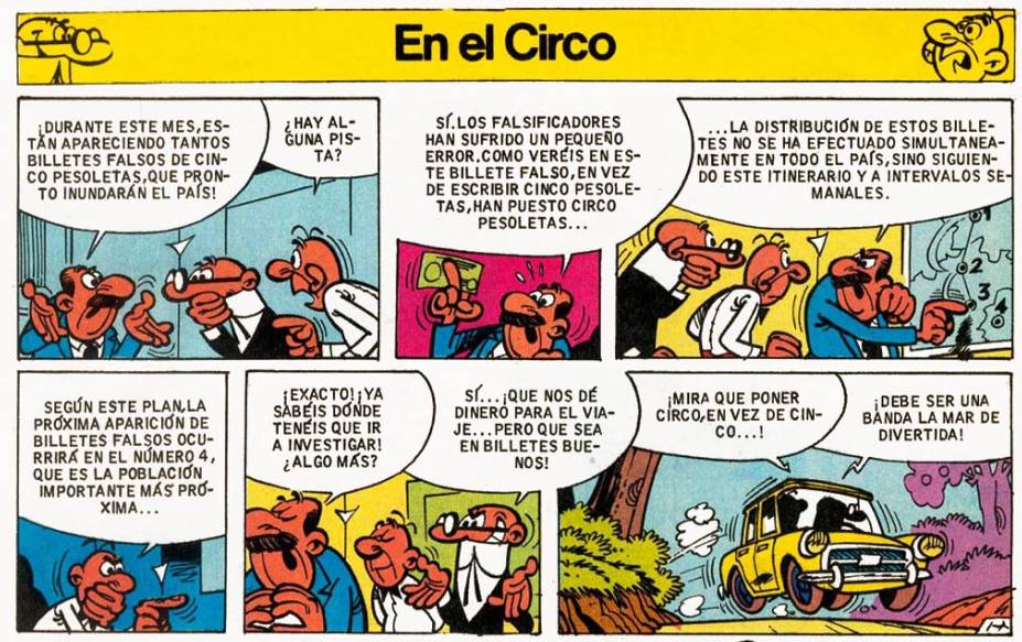 El número de billetes falsos de cinco pesoletas es tal que pronto inundarán el país. El Súper ha pedido a Mortadelo y Filemón que se pongan tras la pista de los falsificadores que además han cometido un error en el texto de los billetes en los que reza: "Circo Pesoletas".