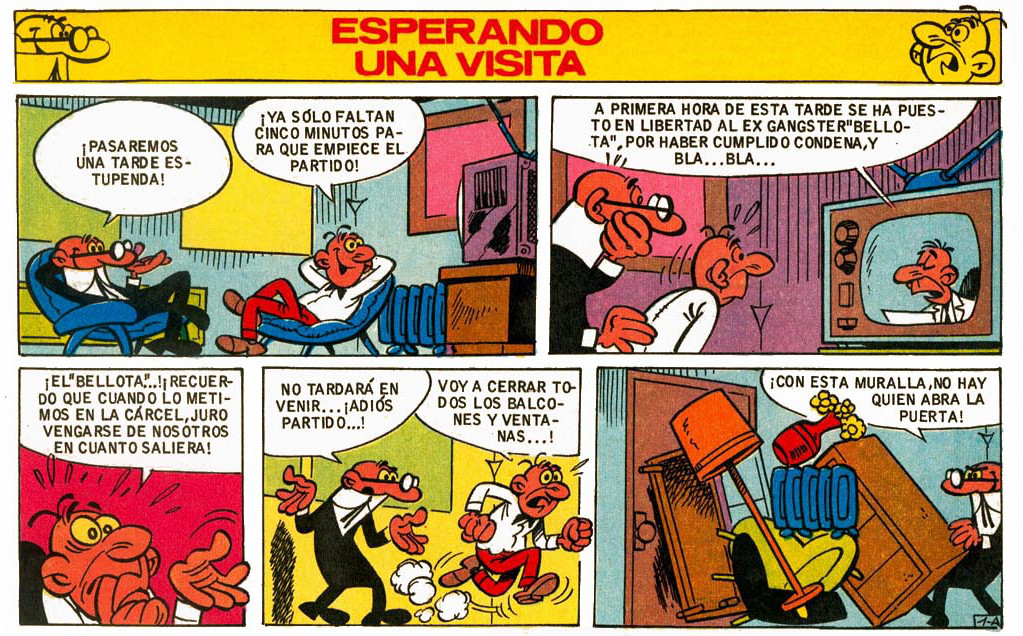 Mortadelo y Filemón se divierten con un partido televisado hasta que contemplan una noticia de última hora: el ex-gángster "Bellota" ha sido puesto en libertad tras cumplir condena. Filemón teme que acuda a su domicilio para tomar venganza como prometió cuando éste le enchironó hace años. Parece inspirada en la historieta de Francisco Ibáñez publicada en el Pulgarcito 1530.
