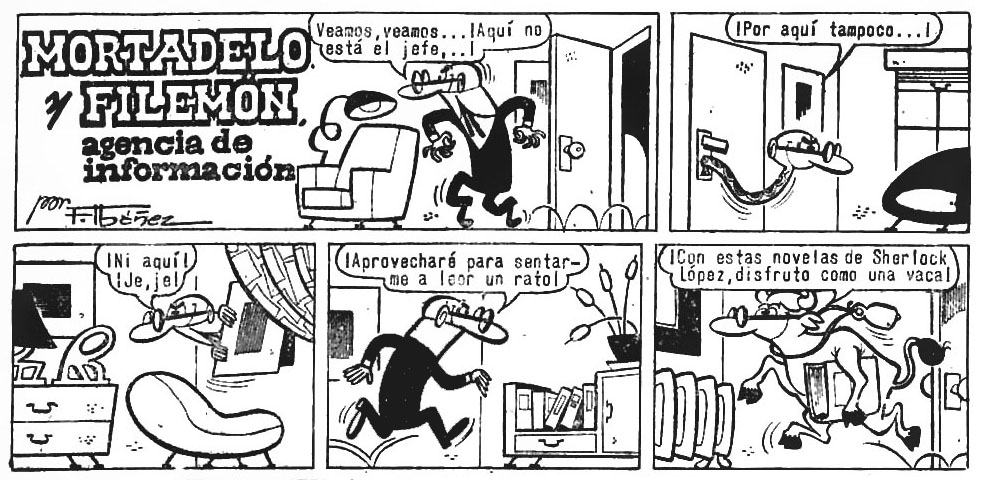 Mortadelo quiere leer pero no hay luz en la agencia por lo que termina subiendo los plomos y electrocutando a Filemón que se encontraba arreglando la lámpara de la salita.
