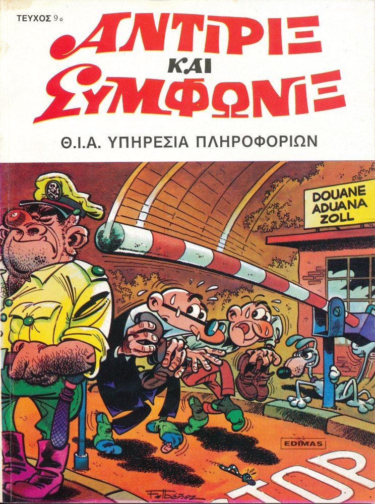 En Grecia las aventuras de Mortadelo y Filemón se publicaron bajo el nombre de "Antirix kai Symphonix", pronunciado Andirix ke Simfonix, y escrito Αντιριξ και Συμφωνιξ. La editorial EDIMAS publicó 84 números a partir de 1993 (y hasta 1999). En los años 2000 y 2001 la editorial publicó 24 números más (bajo el nombre de "Oscar Press" a partir del numero 11) que, aunque llevaron nuevas portadas, contenían reediciones de los primeros números de la etapa anterior. Entre los años 2002 y 2003 se publicaron los últimos 14 números de la colección, que también contuvieron reediciones de números ya publicados. El nombre de los agentes en Grecia viene a significar literalmente algo así como 'El que está de acuerdo y el que no está de acuerdo'.