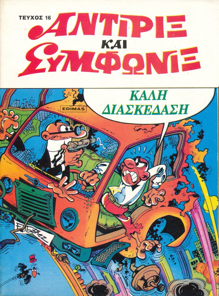 En Grecia las aventuras de Mortadelo y Filemón se publicaron bajo el nombre de "Antirix kai Symphonix", pronunciado Andirix ke Simfonix, y escrito Αντιριξ και Συμφωνιξ. La editorial EDIMAS publicó 84 números a partir de 1993 (y hasta 1999). En los años 2000 y 2001 la editorial publicó 24 números más (bajo el nombre de "Oscar Press" a partir del numero 11) que, aunque llevaron nuevas portadas, contenían reediciones de los primeros números de la etapa anterior. Entre los años 2002 y 2003 se publicaron los últimos 14 números de la colección, que también contuvieron reediciones de números ya publicados. El nombre de los agentes en Grecia viene a significar literalmente algo así como 'El que está de acuerdo y el que no está de acuerdo'.