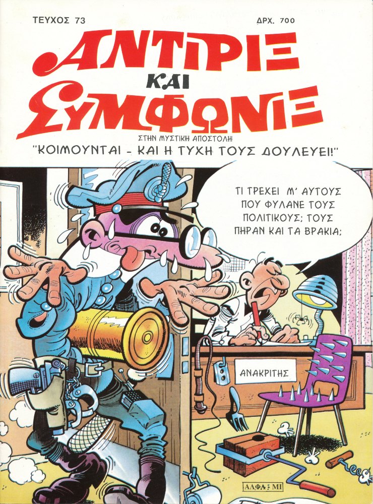 En Grecia las aventuras de Mortadelo y Filemón se publicaron bajo el nombre de "Antirix kai Symphonix", pronunciado Andirix ke Simfonix, y escrito Αντιριξ και Συμφωνιξ. La editorial EDIMAS publicó al menos 81 números a partir de 1985 y al menos hasta 1993. El nombre de los agentes en Grecia viene a significar literalmente algo así como 'El que está de acuerdo y el que no está de acuerdo'.