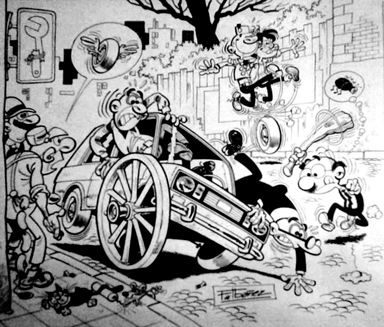 Ilustración de Francisco Ibáñez nunca publicada (h.1986). Original de Carlos Areces compartido por Raúl Suay. Siendo apaisada, parece que Ibáñez pudo haberla dibujado para el mercado alemán, aunque quizá no llegó finalmente porque la historieta no llevó finalmente dicha portada. Imposible saberlo hasta la fecha.