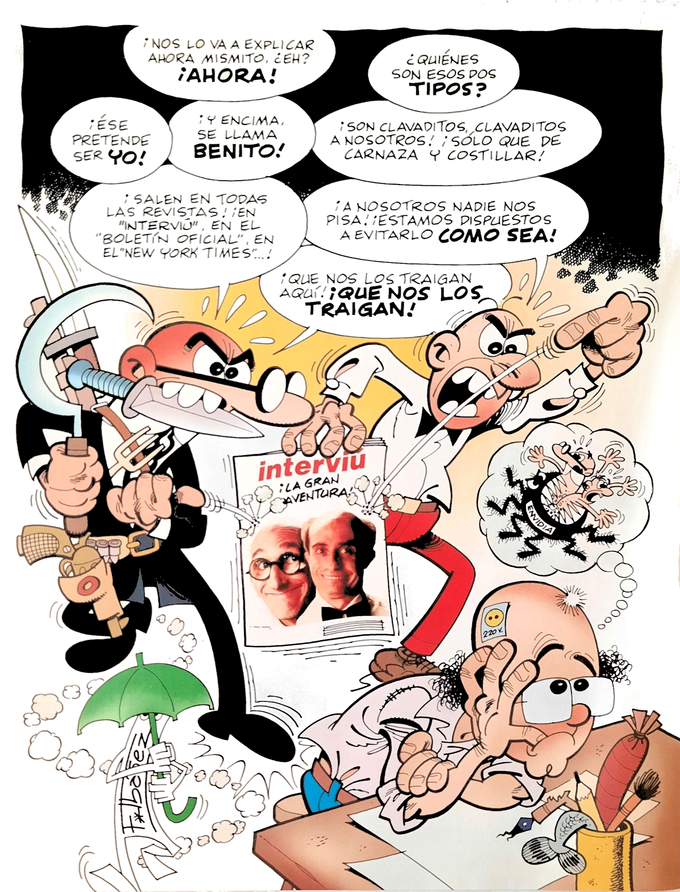 Ilustración de Ibáñez para Interviú con motivo del estreno de la primera película de los personajes con actores en carne y hueso. Publicado en el ejemplar del 27 de enero de 2003. Ilustración enviada por Janiji.