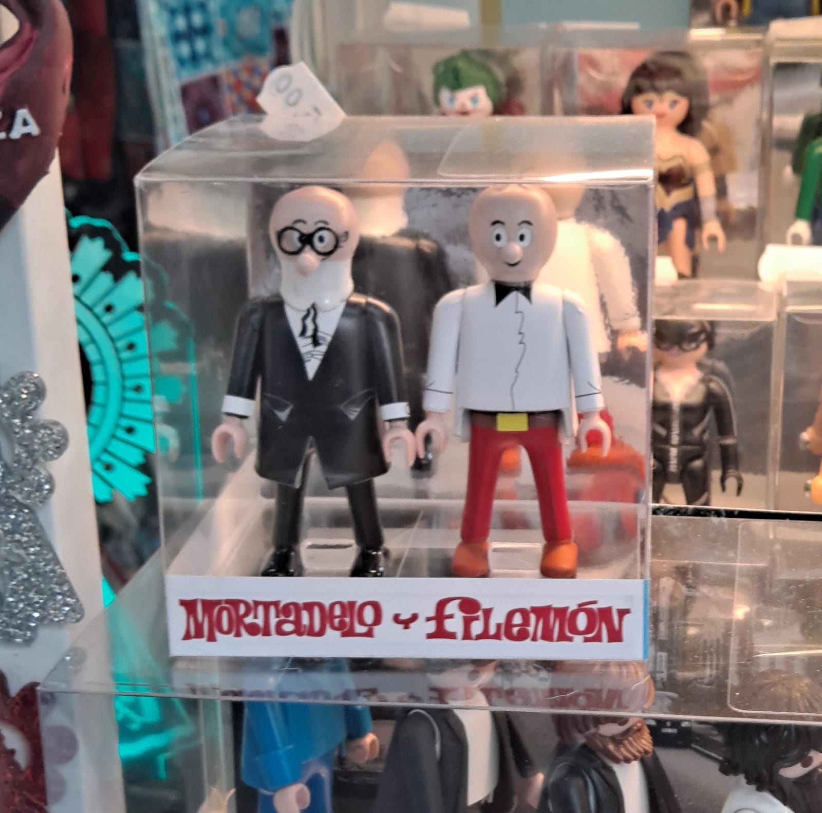 Muñecos de Playmobil de Mortadelo y Filemón customizados. Vistos en una tienda en Córdoba (2025). Imagen compartida por Chespiro.