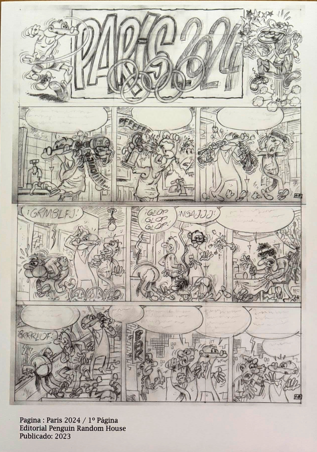 Página original del álbum "París 2024" dibujada por Ibáñez. Original enviado por Chespiro y compartido en Facebook con motivo de la Feria de Munich dedicada al dibujante (2025).