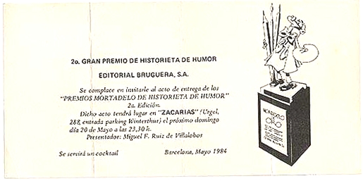 Invitación a los "PREMIOS MORTADELO HISTORIETA DEL HUMOR" en los que tenía lugar el fallo del jurado y la entrega del "Mortadelo de Oro". Imagen cedida por