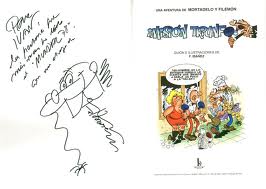 Dedicatoria de Francisco Ibáñez. Mortadelo con arañita colgando de la nariz.