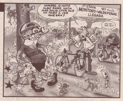 Ilustración de Francisco Ibáñez para "El Periódico de Catalunya" con motivo de la Vuelta Ciclista a España de 2000 (año en que Mortadelo y Filemón fueron mascotas oficiales). Imagen correspondiente a la tercera etapa de la vuelta. Imágenes tomadas de "El rincón de Mortadelón".