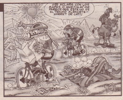 Ilustración de Francisco Ibáñez para "El Periódico de Catalunya" con motivo de la Vuelta Ciclista a España de 2000 (año en que Mortadelo y Filemón fueron mascotas oficiales). Imagen correspondiente a la quinta etapa de la vuelta. Imágenes tomadas de "El rincón de Mortadelón".
