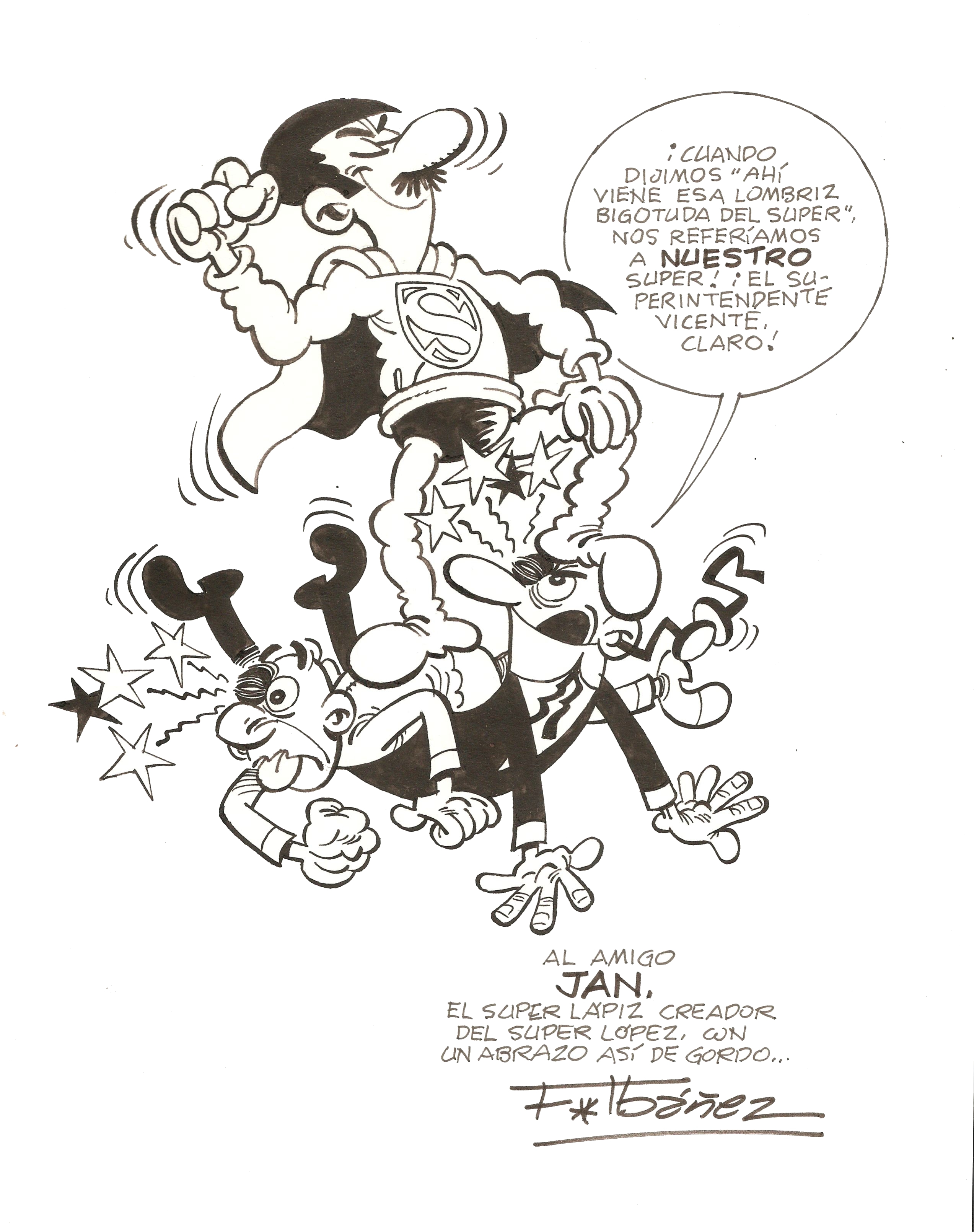 Dedicatoria de Ibáñez para la revista "Maltravieso". Super López pisotea a Mortadelo y Filemón. Imagen donada por Monchi.
