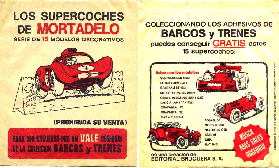 Los supercoches de Mortadelo. Sobre que contiene un cromo-obsequio de la colección "Barcos y Trenes". 15 modelos diferentes (ver sección "Ilustraciones" para ver algunos de dichos modelos). Bruguera (1973).