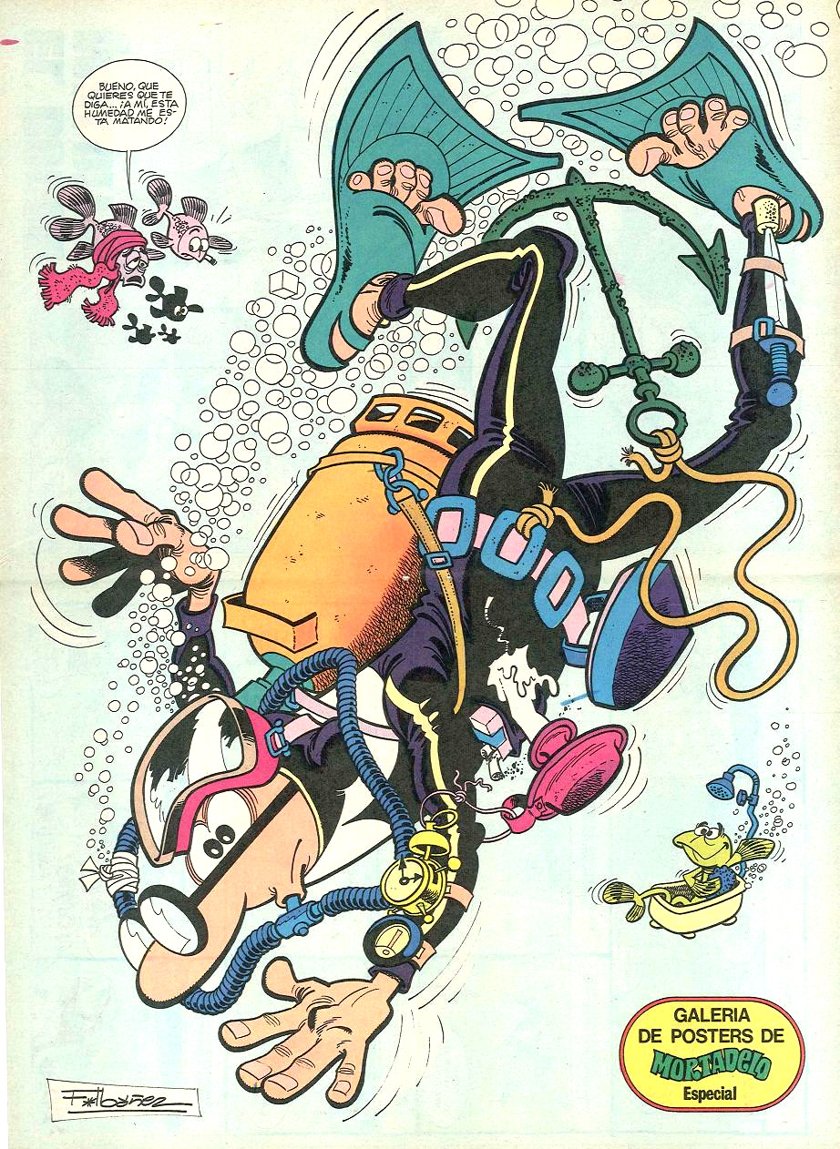 Mortadelo disfrazado de submarinista. Publicado en la revista Mortadeo Especial nº 101. Imagen enviada por miski y escaneada por Isiyura.